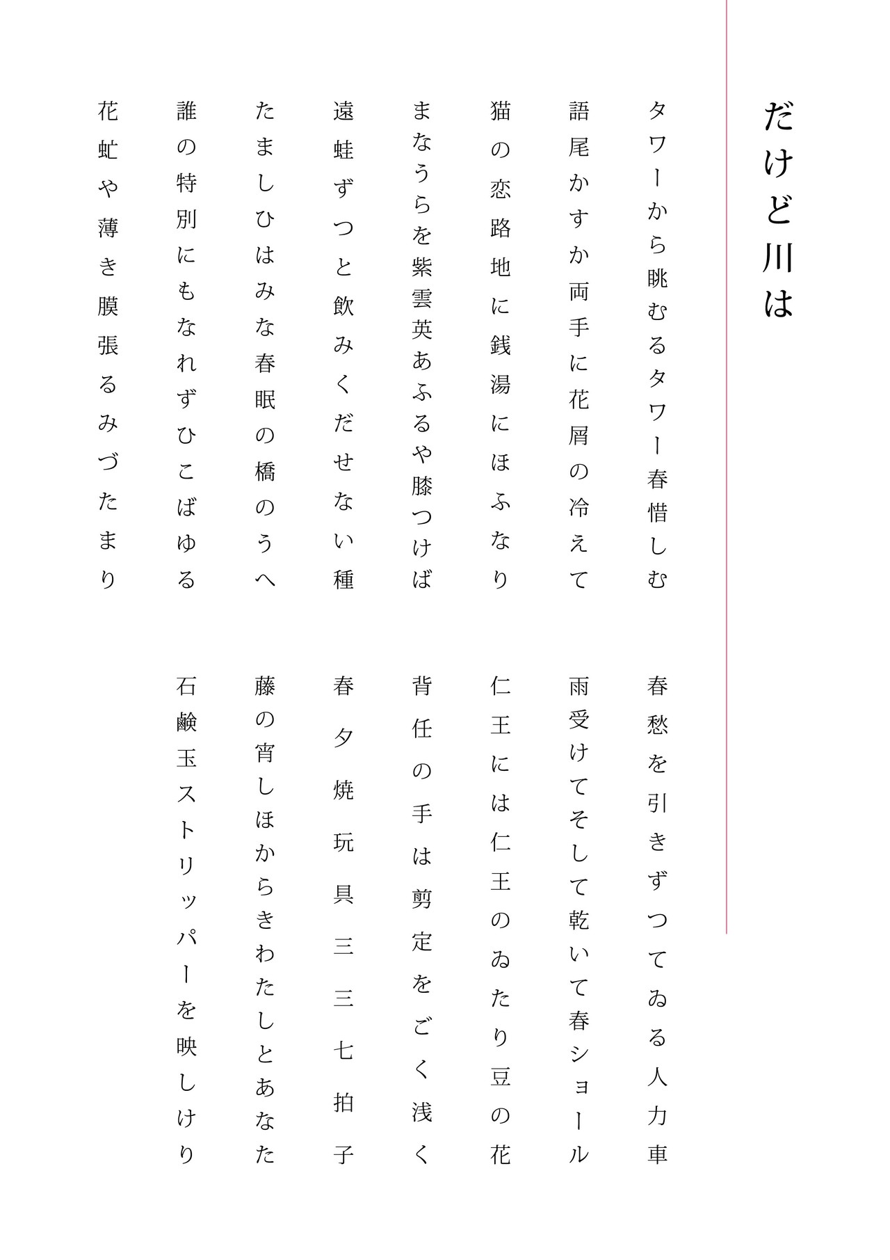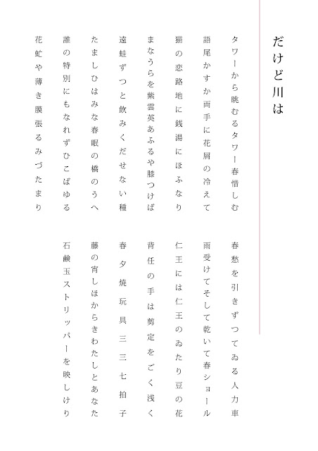 HOME作品 【俳句連作15句】だけど川は 2021年12月30日 作品 俳句 だけど川はタワーから眺むるタワー春惜しむ語尾かすか両手に花屑の冷えて猫の恋路地に銭湯にほふなりまなうらを紫雲英あふるや膝つけば遠蛙ずつと飲みくだせない種たましひはみな春眠の橋のうへ誰の特別にもなれずひこばゆる花虻や薄き膜張るみづたまり春愁を引きずつてゐる人力車雨受けてそして乾いて春ショール仁王には仁王のゐたり豆の花背任の手は剪定をごく浅くC春夕焼玩具三三七拍子藤の宵しほからきわたしとあなた石鹸玉ストリッパーを映しけり 【俳句連作20句】明朝体 【俳句連作10句】みんなゐなくなる